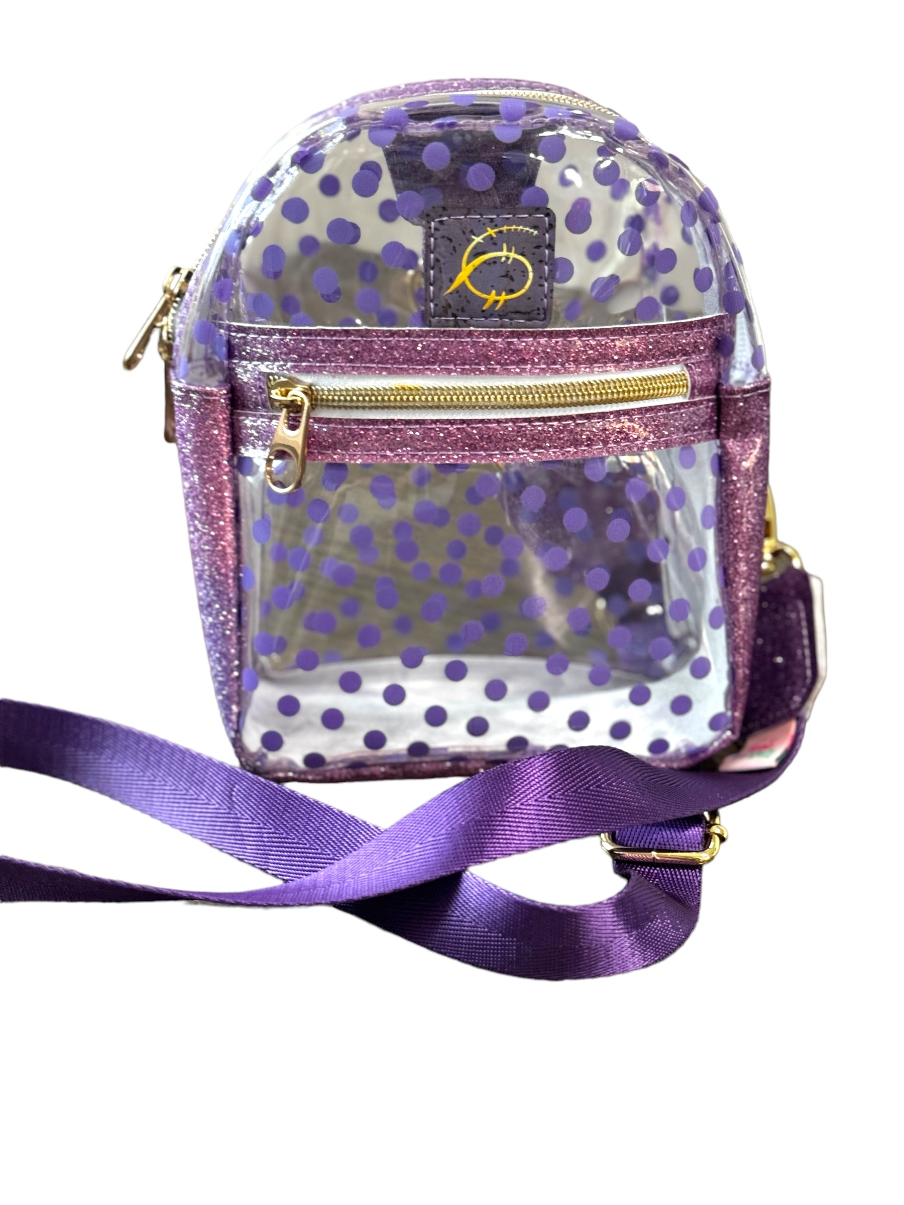 These adorable little sling backpacks are made from transparent vinyl! Perfect for upcoming concerts and sporting events that require a clear bag.