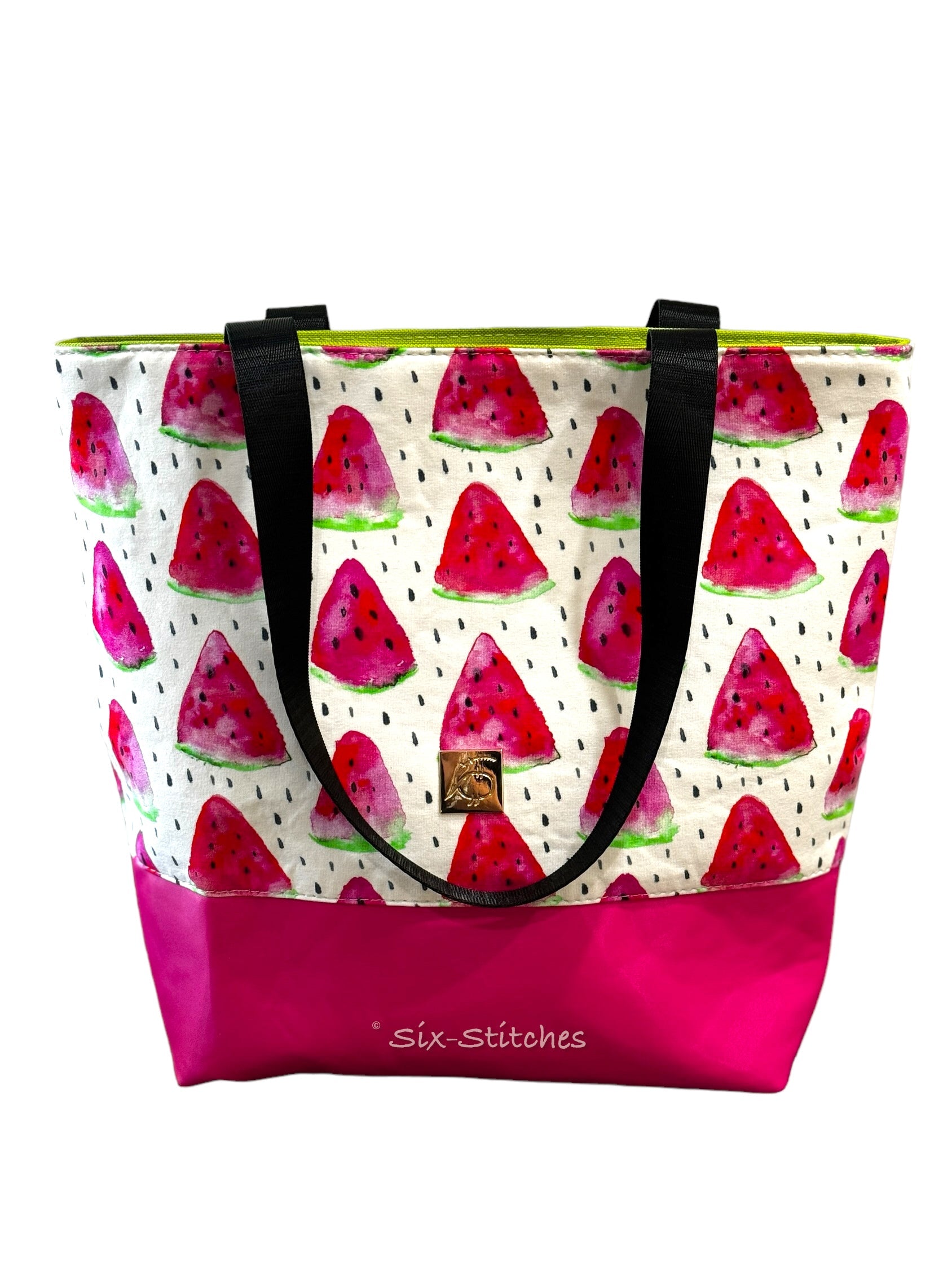 Each tote has coordinating cotton webbing handles and is lined with black waterproof canvas. Hardware, handle or interior colors subject to change. Custom orders upon request!